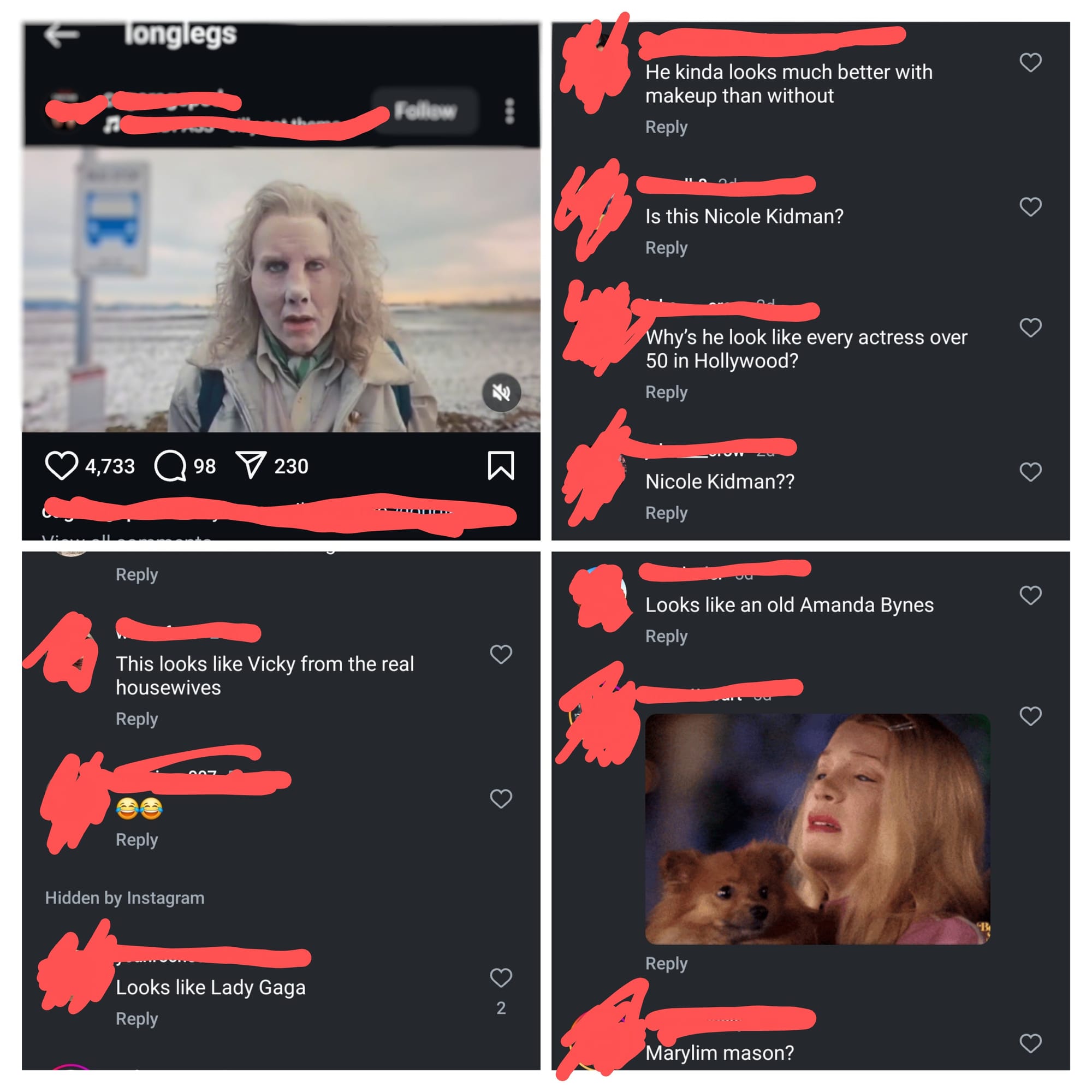 Meanwhile, when I click a random post about the movie on Instagram, I can find a dazzling bouquet of comments from people who had no difficulty making jokes about Longlegs looking like a woman: